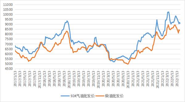 中国汽、柴油批发价格显示,上周(8月8日-8月12日),全国92#汽油、柴油(含低凝点)平均批发价格分别为9099元/吨、8368元/吨,较前一周分别下跌75元/吨、68元/吨,汽、柴油总体价格水平环比下跌。图表:中国汽柴油批发价格指数周度均价走势图(单位:元/吨)