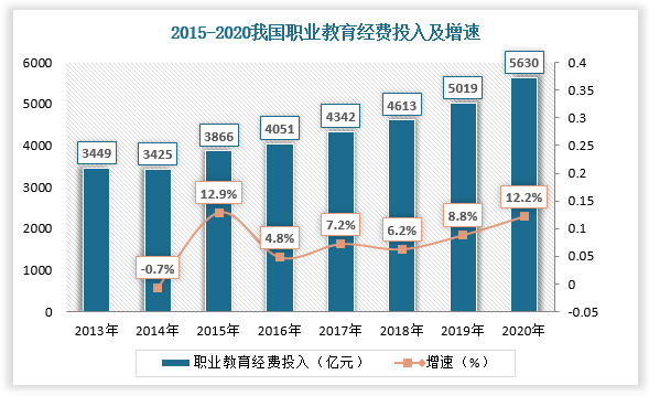 事实上,国家针对职业教育的经费投入也确实在连年攀升。2019年,我国职业教育经费投入为5019亿元,较上年同比增长8.8%;2020年,我国职业教育经费投入为5630亿元,较上年同比增长12.2%。