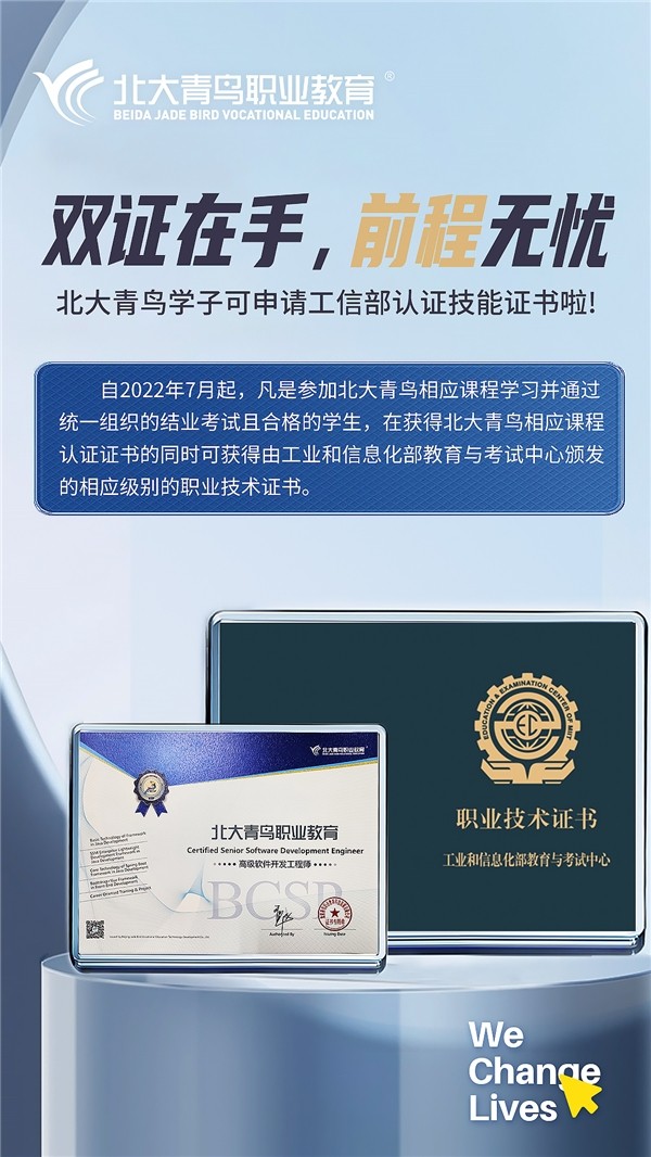 今年,为进一步增强人才核心竞争力,北大青鸟与工信部教育与考试中心达成合作关系,自2022年7月起,北大青鸟学员在获得北大青鸟颁发的技能证书同时还可申请获得工信部教育与考试中心认证颁发的相应级别《职业技术证书》!学技能同时拿双证,大大提升人才专业性,提升IT技能含金量。