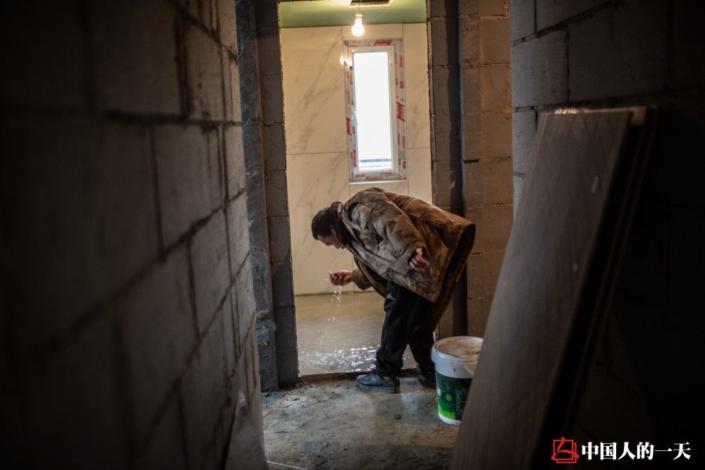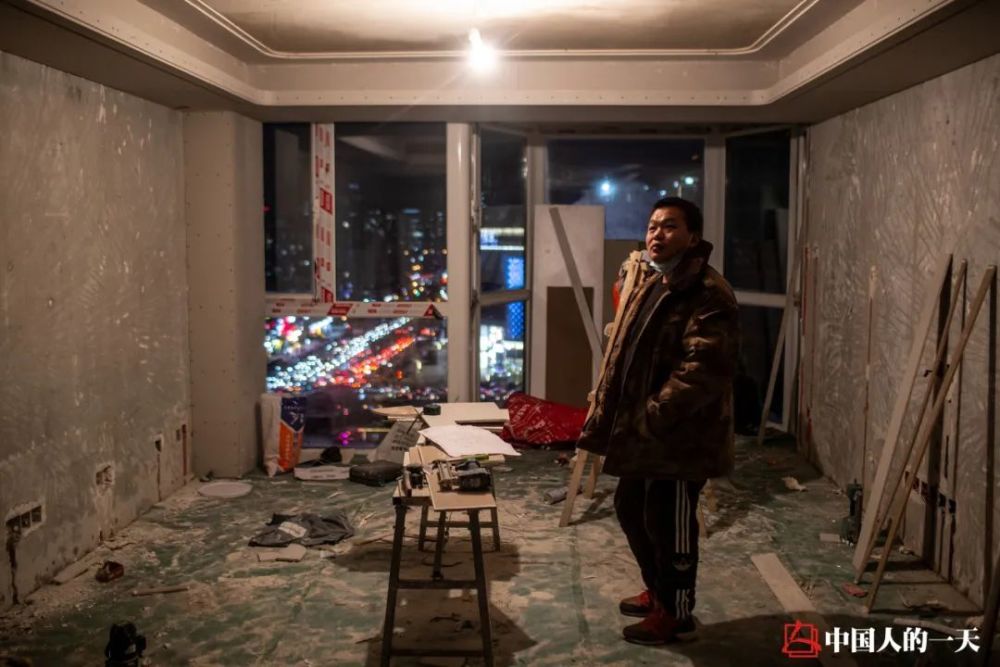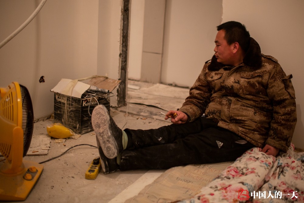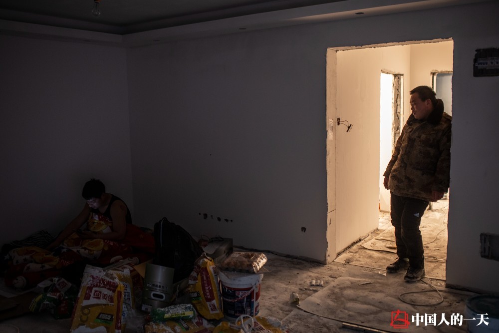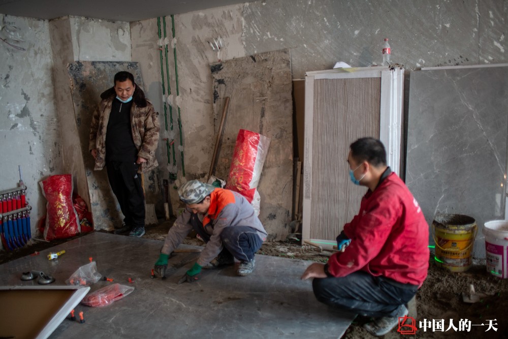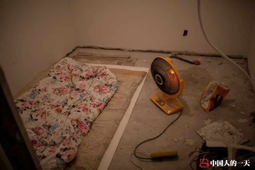 李勇把车停在小区门口,从柜子里卸下工具,抱着被子进了小区,钻进了一所装修中的房子。打开门,暖气扑面而来,工人在铺地砖,一切进展顺利。