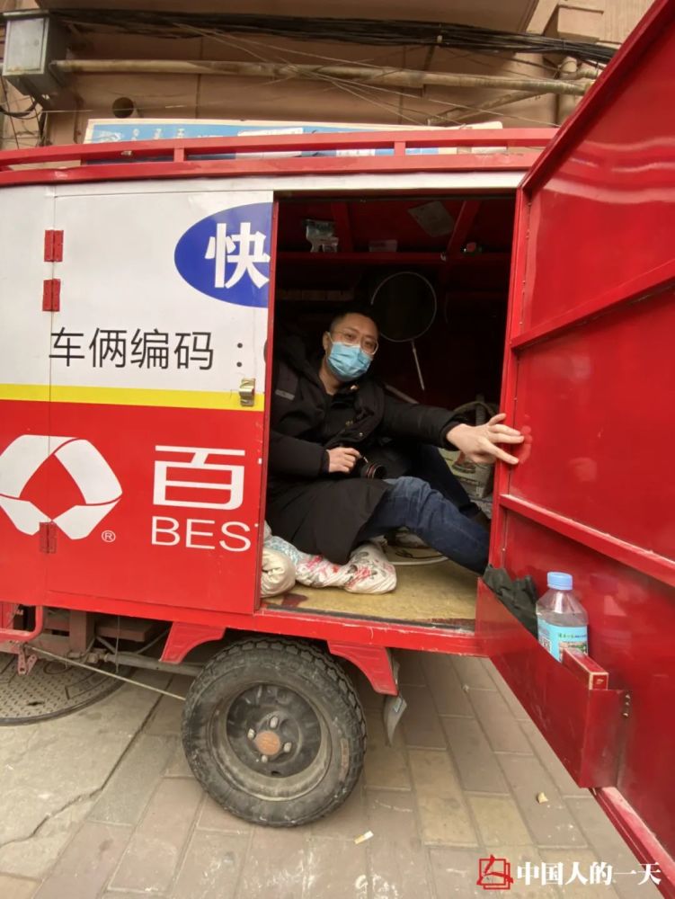 从快递车柜子里,李勇取出被子,就是为自己和工人师傅们预备的。在工地过夜,对他来说是家常便饭。