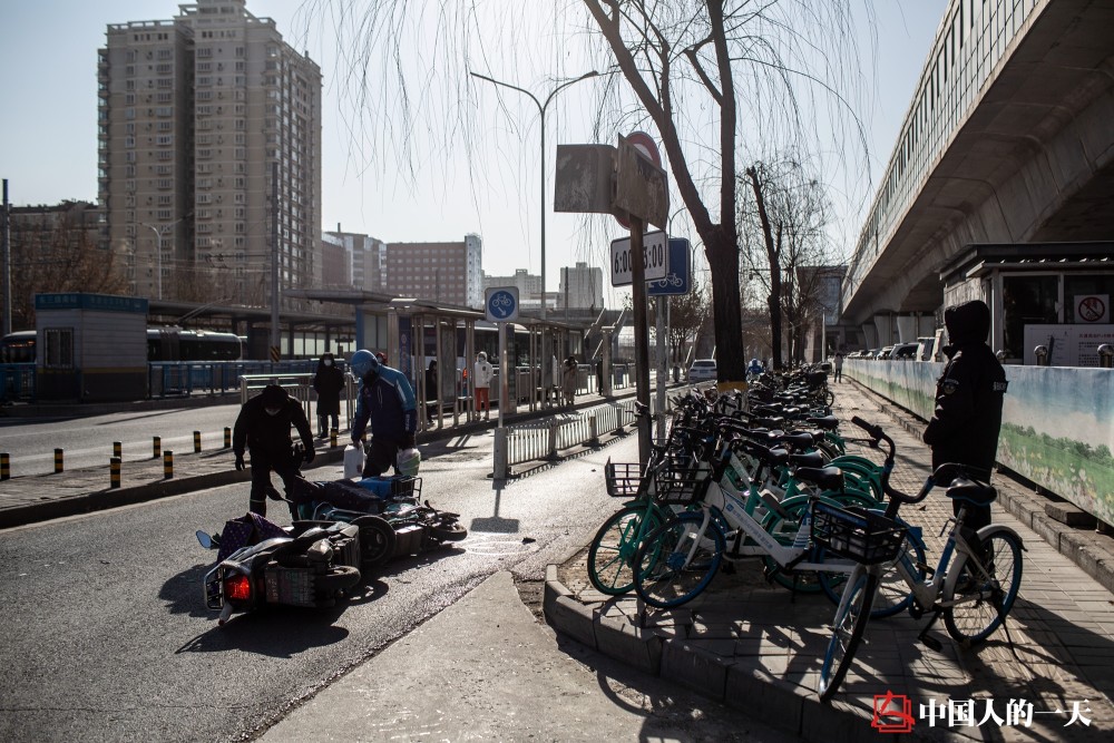 跟工人们吩咐了施工细节后,李勇又赶往另一个工地,位于15公里外的三元桥。因为寒潮和新冠疫情,街道比以前空旷了很多。李勇骑车来到小区门口,一路上只见到了几位和他一样,骑行在寒风中的外卖员。