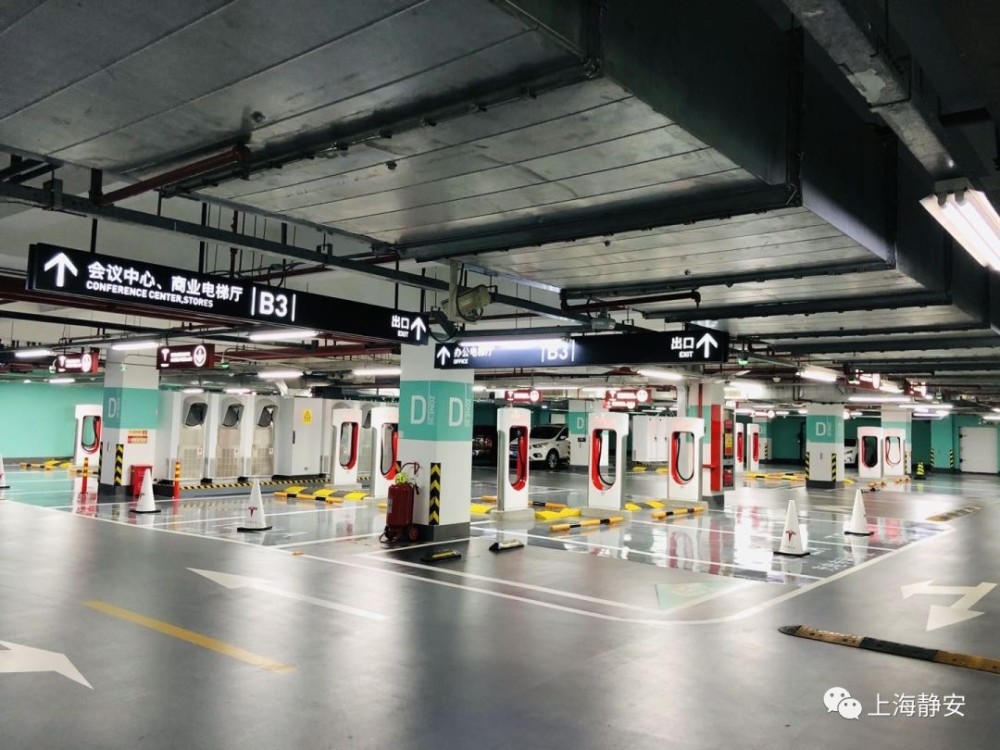 该超级充电站位于静安国际中心地下3层停车场,入口处和停车场都有清晰可见的红色标牌,车主可根据指引轻松找到。