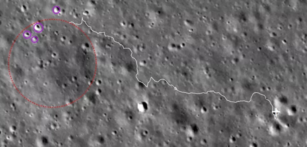 距离最近反射率较高的撞击坑(紫色圆圈区域),虚线红色圈为退化撞击坑