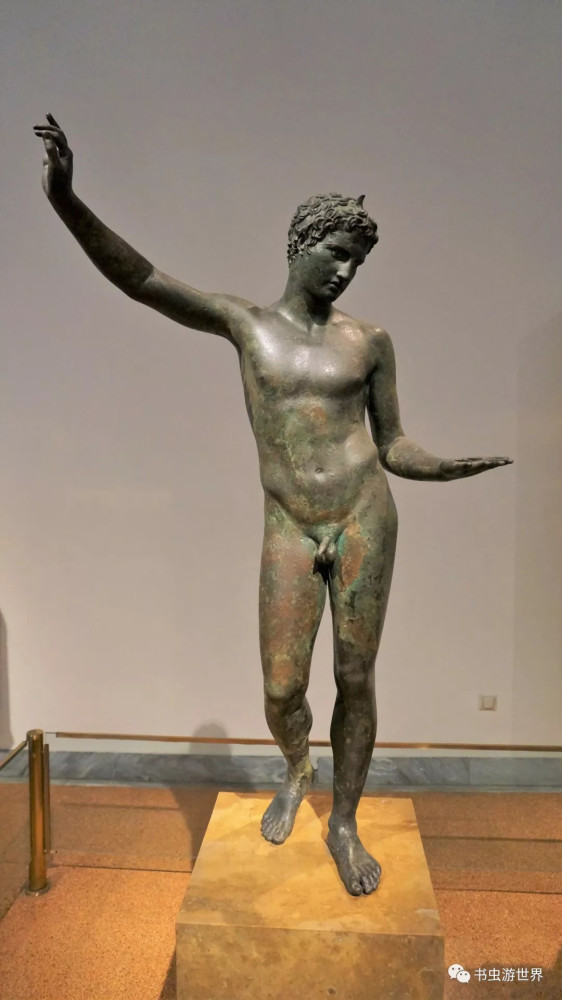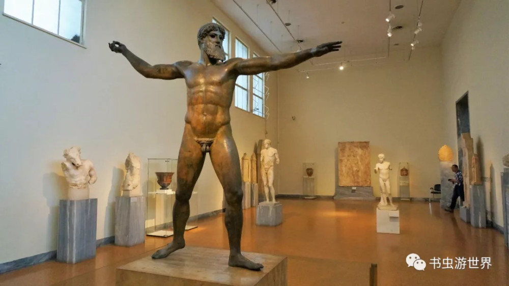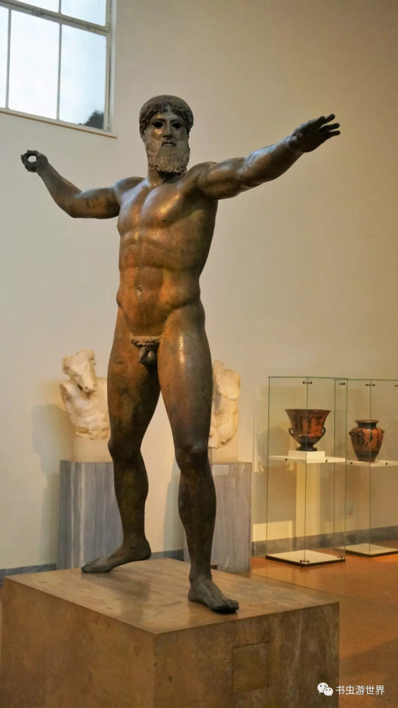 刚走进古典雕塑的第一个展室,我们就被大厅中央的青铜雕像吸引过去。它是著名的宙斯或波塞冬雕像,之所以无法判断,是因为他右手欲投掷的神器没被保存下来。如果那件神器是霹雳闪电便是天王宙斯,如果是三叉戟则为海神波塞冬。考古博物馆介绍说目前多数学者倾向于前者。为什么这么说呢?大概源自雕像面部那庄严坚毅的神情吧。欣赏这尊雕像需站在它的四分之三正面,也就是正对面部的角度,至少人们认为这是雕塑家的意愿。从这个角度观察,天神的头发被一根发辫箍住,整齐利落;柔软的胡须呈波浪式的小卷,优雅洒脱;虽然看不到眼珠,但你能感受到那股不容置疑的眼神,只有天王宙斯才配得上这般神圣。他左手伸向前方,似乎在比对着目标方向,右手握着武器在后方蓄力。直立身体的重心微微向前,这从他双脚的姿势可以感受得很清楚,他的右脚跟已经抬离地面,左脚则坚实地踩在地上,随时准备承受全身的重量。这样一尊2.09米高大舒展的雕像,几乎没有人敢用大理石去制作,不仅耗费石材而且极难成功完成。它带给我们的震撼因此而更加难得。毫无疑问,这尊制作于公元前460年的作品是一件足以传世的大师之作。