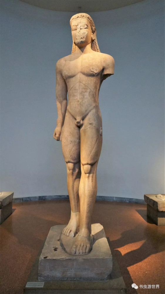 古风时期最多的是库罗斯像,这尊断臂的库罗斯像发现于阿提卡半岛南端苏尼翁角的波塞冬神庙附近,距今已有两千六百多年历史。雕像高3.05米,尺寸远大于真人。库罗斯像受古埃及雕像的影响,大多面无表情或露出“古风式的微笑”,身体直立呆板,左腿微微迈向前方。你看这尊雕像腹部的肌肉,就用几根直线简单勾勒出来,完全是程式化的做法,膝盖的线条也显得十分僵硬。