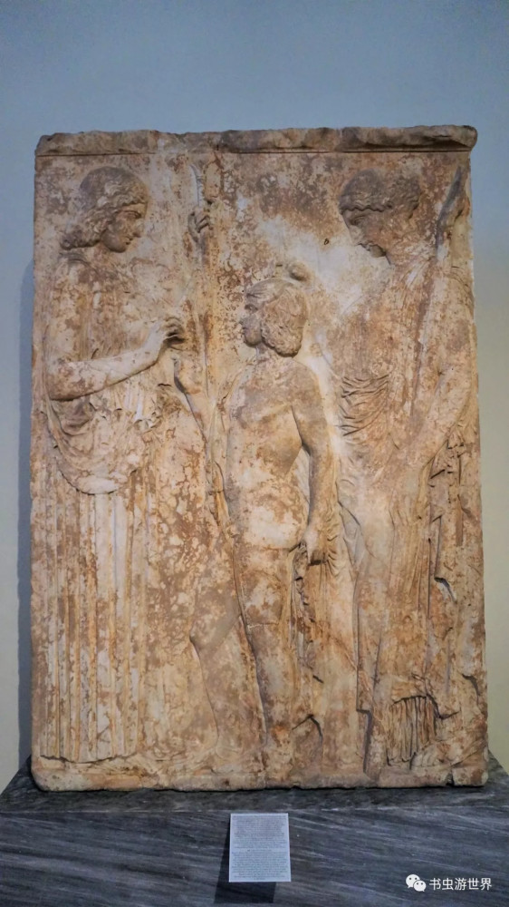 在阿波罗身后靠墙的位置立着一个著名的秘仪浮雕,人们判断它在古代已非常知名是因为它在罗马时期曾被大量复制。如今在包括纽约大都会博物馆在内的很多地方都收藏有它的古代复制品,但这个制作于公元前440-430年的原作就立在我们面前。这件浮雕出自雅典西北18公里的古城埃莱夫西斯(Eleusis)。传说谷物女神得墨忒耳的女儿珀耳塞福涅被哈得斯抢走做冥后,得墨忒耳追讨途中经过埃莱夫西斯时受到国王科列奥斯(Celeus)的款待,她看到小王子特利托列摩斯(Triptolemus)体弱多病,便用自己的乳汁喂养他,使他迅速变得强壮起来。不仅如此,谷物女神还将种植谷物的技术传授给特利托列摩斯,并通过他传遍整个希腊。从此,埃莱夫西斯开始流行一种祭神的秘仪,这件出自得墨忒耳神庙的浮雕板表现的就是该秘仪中的场景。处于中间的赤裸少年便是特利托列摩斯,左边身着长袍手持权杖的是得墨忒耳,她正将谷穗交给小王子。我们在浮雕中找不到谷穗是因为人们推测它是金属制作镶嵌上去的,现已丢失。右边站着手持火炬的珀耳塞福涅,她右手放在小王子头上向他祝福。