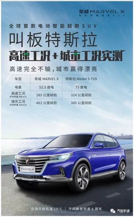在此前的测试中,荣威MARVEL X在均速88km/h的高速工况下续航达到285公里,能够达到特斯拉的标准水平。同时,均速32km/h的城市工况中,MARVEL X则跑出了403公里的续航。需要提出一点的是,MARVEL X只用52.5度的电量跑出了特斯拉75度电的续航里程,百公里耗电只有14KWh。这一耗电量控制得益于Marvel X控制得较好的重量,仅有1.7吨,另一方面较低的车身也减小了风阻,整车风阻只有0.29cd。
