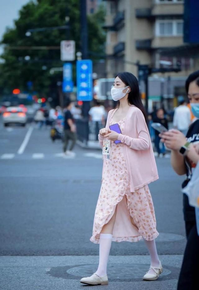 穿甜系穿搭的女人还可以试一下碎花裙,用轻薄透气的防晒衫搭配碎花裙,再使用半透明的小腿袜进行点缀。