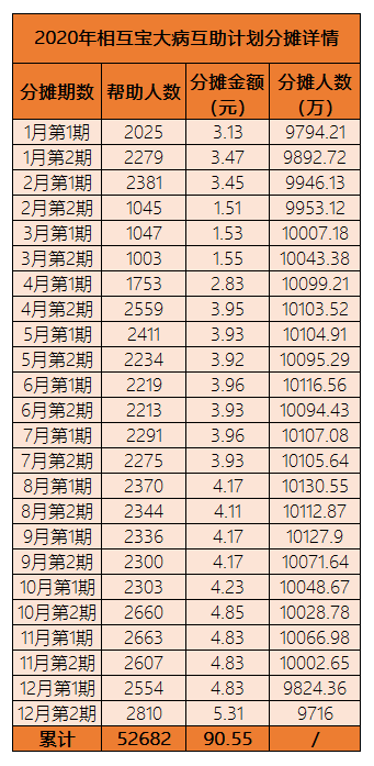 12月28日,相互宝2020全年账单出炉。公示信息显示,60岁以内用户参加的大病互助计划12月第2期人均分摊5.31元,共救助2810人。2020年全年,相互宝大病互助计划全年分摊金额为91元,低于年初预测的188元最高线。2年时间,相互宝成员累计救助人数达85203人。