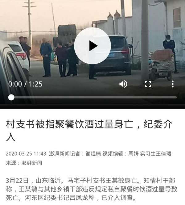 据澎湃新闻报道:3月22日,山东临沂。马宅子村支书王某敏身亡。知情村干部称,王某敏与其他乡镇干部违反规定私自聚餐时饮酒过量导致死亡。河东区纪委书记吕凤龙称,已介入调查。