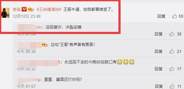 有趣的是李诞也去评论王自健的博文,并特意提到“王哥牛,给我都看难受了”,是“王哥”,而不是“自健”,可李诞是11点多发的评论,王自健在凌晨回复了一拨人,就没回复李诞,也难怪有网友直接说:“没回复你,决裂实锤”。