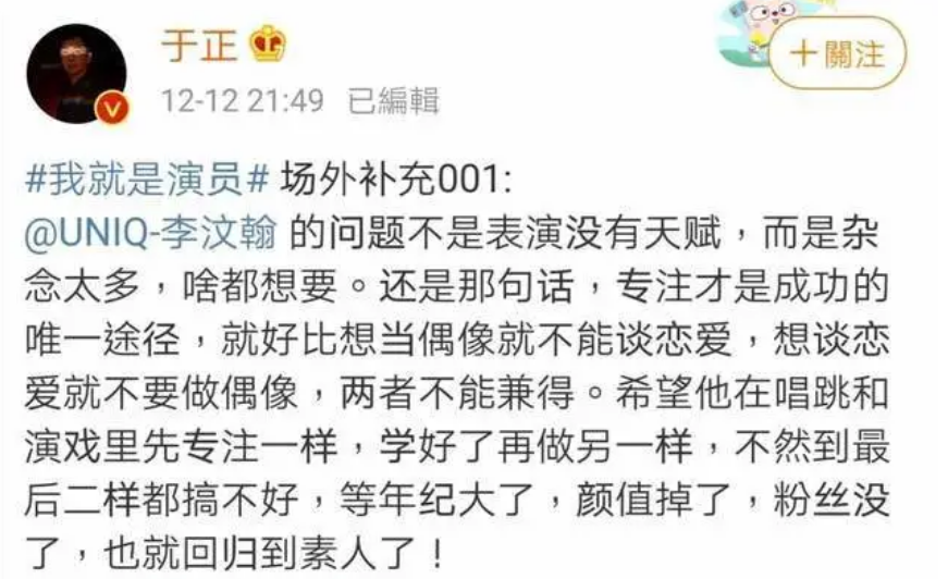 李汶翰和于正在节目播出后很快就登顶热搜了,于正本人还在社交平台发文,对李汶翰的表演再次进行点评。