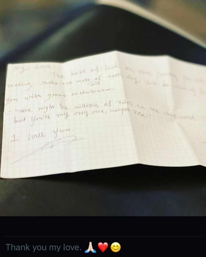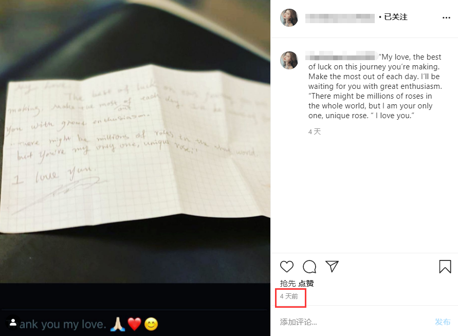 能够说出“我是你的唯一,独一无二的玫瑰”这句话,就这份自信来说,两人的关系已经相当亲密了,而且还在手写情书上写到“Thank you my love(谢谢你我的爱人) ”,并给了一个爱心的表情,想必也给予了她很多有意义的爱,让她感到幸福吧。