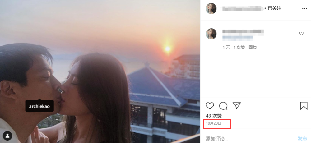 这位疑似高圣远的新女友一共发布了两条动态,第一条亲吻照发布时间是10月20日,第二条手写情书的发布时间是在12月19日。