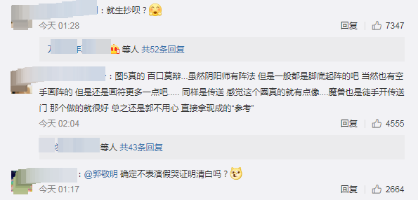 当然,也有网友是站在郭敬明这边的。他们觉得这种特效风格就是宗教图文,日漫阴阳师中很常见,“都是从古书上扣下来的,图案还不一样?”此外,还有网友表示在别的影视剧和游戏中都曾见过类似的图案,郭敬明的《晴雅集》实在算不上抄袭。