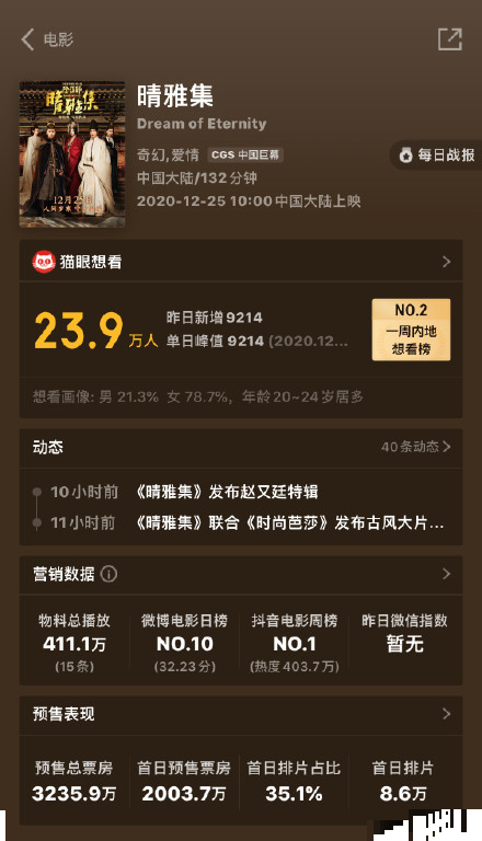 除了用电影官博释出各种各样的预告片外,自己的微博也是非常卖力。不仅如此,这段时间郭敬明频繁带着邓伦和赵又廷等主创人员接受媒体采访甚至还现身网红直播间,其目的自然是宣传电影。而这些方式确实也起到了很大的作品,目前《晴雅集》的预售票房已经突破三千万,且涨势喜人!