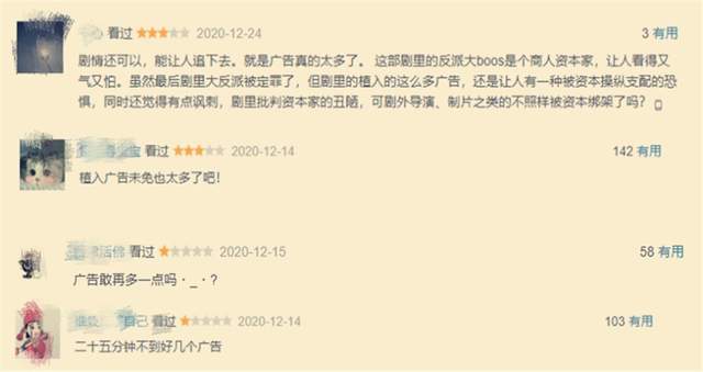 站在不能纵容广告泛滥的角度,便会有观众用低分警示,《巡回检察组》差评里广告被提及的频率,占了近三分之一的比例。