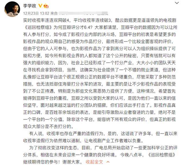 面对这种情况,《巡回检察组》制作人李学政发文进行解析,字里行间都在指责打分不公平,暗示作品遭遇“黑恶势力”打压。